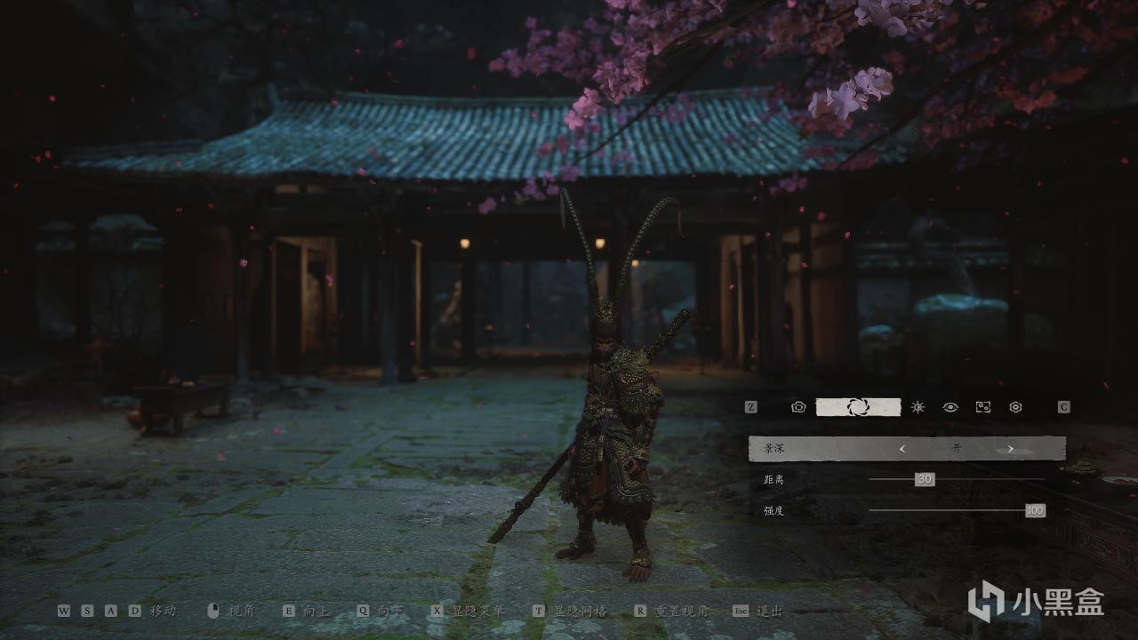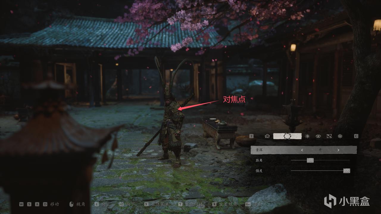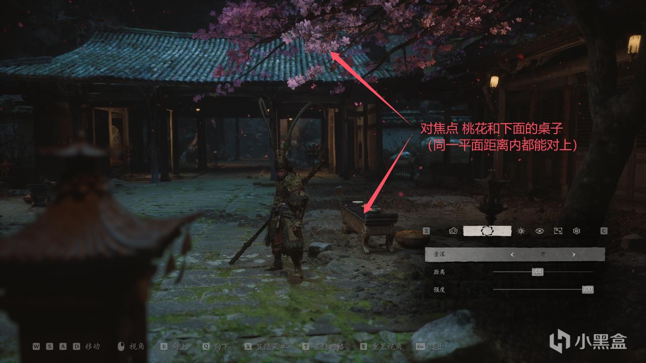 最後,我想說的是,雖然遊戲很好玩,畫面場景也很驚豔,但個人感覺拍照模式有點單一,對焦操作不夠自由,對焦點沒有UI提示。他不像地平線或者其他某些遊戲,在不改變畫面視角以及焦距的情況下,可以直接操作對焦點上下左右移動。而在《黑神話:悟空》中只能通過調整攝距、焦距和方向去對焦到同一焦平面內,這樣就會出現上如圖的情況,桃花和桌子都對上了,層次不夠分明,不想太清晰的物品也清晰的顯示了。