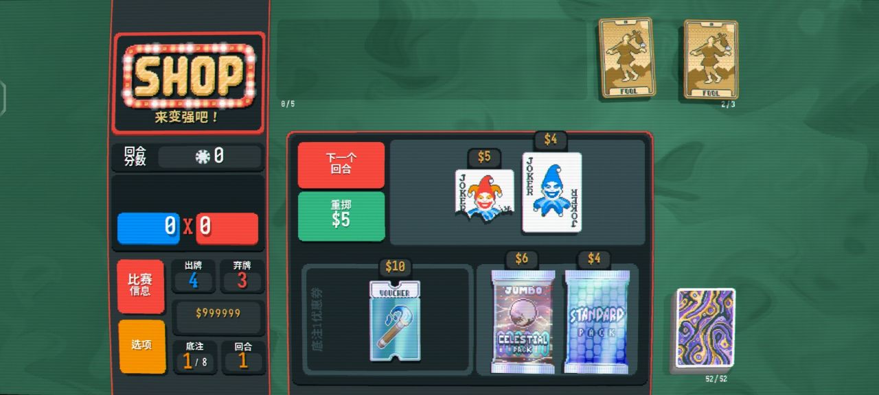 幻靈牌,購買打開可以獲得18張功能型卡牌,可以強化牌型,小丑牌,獲得塔羅牌小丑牌,是一種十分強大的增益卡包。