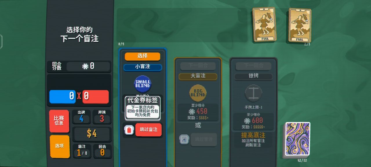 左下角的是優惠券,可以理解爲永久性增益buff可以提供出牌次數,棄牌次數,增加手牌,增加功能牌等等,每通過一個boss關卡便會刷新(部分盲注跳過增益也會有商店刷新優惠券)優惠券共有32張有兩種,一種普通版本,一種升級版,實際上可以認爲只有16張,獲得了就是屬於永久增益,查看可以在-比賽信息-優惠券-查看