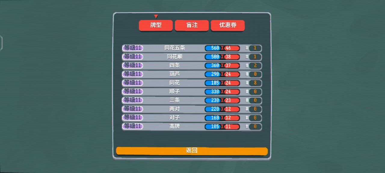 (新手最友好的是同花,達成難度低,而且初始倍率籌碼也高)