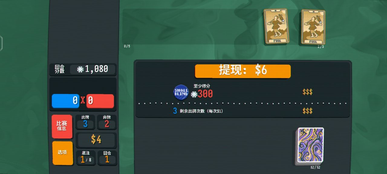 每過一個關卡都可以獲得金錢獎勵,出牌次數也會一比一兌換爲金錢,所以用最少的出牌次數通過關卡,來獲得更多的錢,當金錢超過5個以上時,每5個會有一個的利息,最高到5,可以通過商店購買增加利息的小丑牌來獲得更多利息。