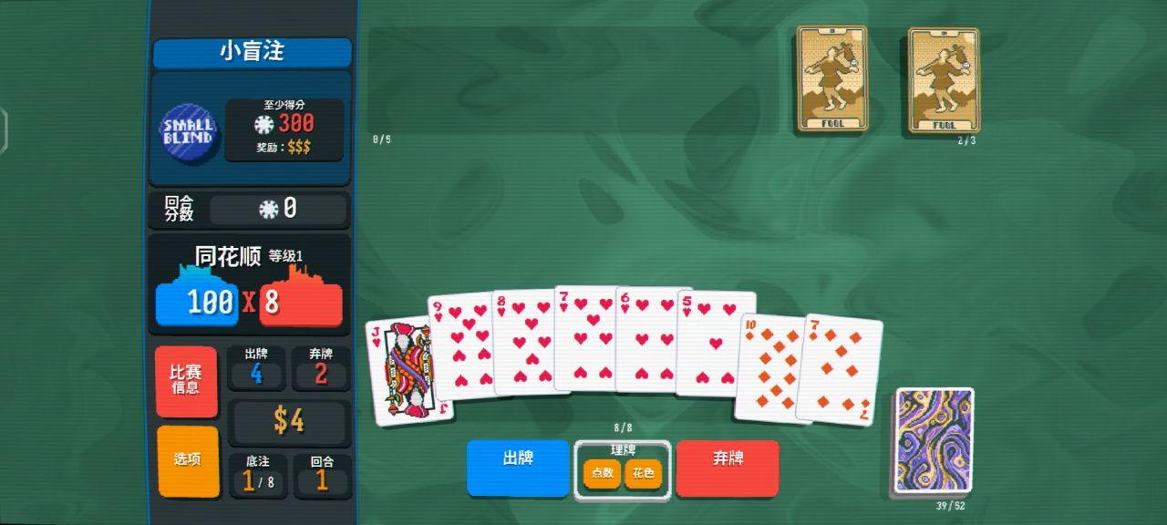 遊戲初始會有4次出牌和棄牌次數,後續可以通過小丑牌,優惠券進行增加,每次可以出或者丟棄五張卡牌,棄牌就是換牌,通過棄牌來搭配自己所需要的牌型。(手牌上限爲8)