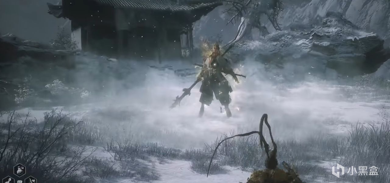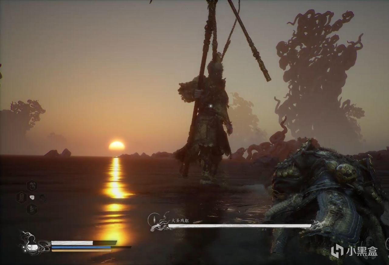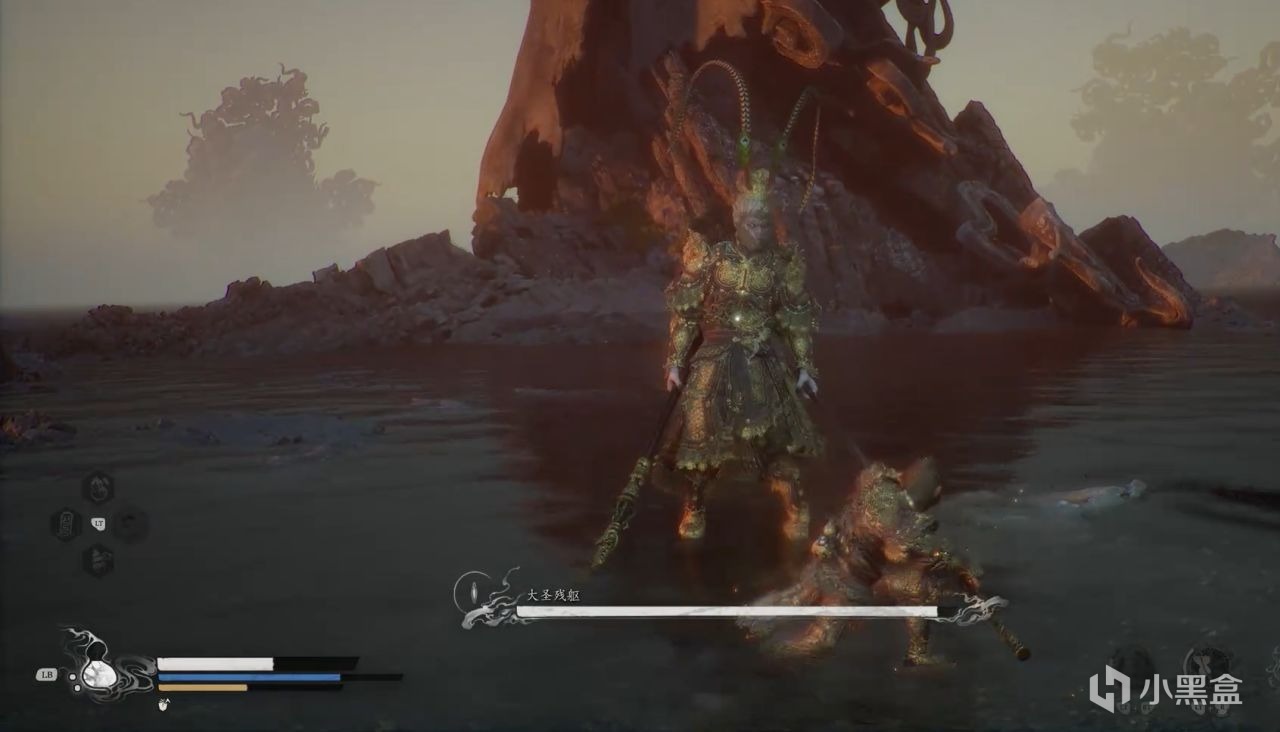 大聖殘軀,這個就是典型代表,一共四個階段,各種投技,變換形態都非常精彩。在大聖殘軀取回你身上的根器時,你變回了馬嘍。在最後一階段中,有各種非常有趣的投技演出。比如,大聖會定身術搶你葫蘆喝。