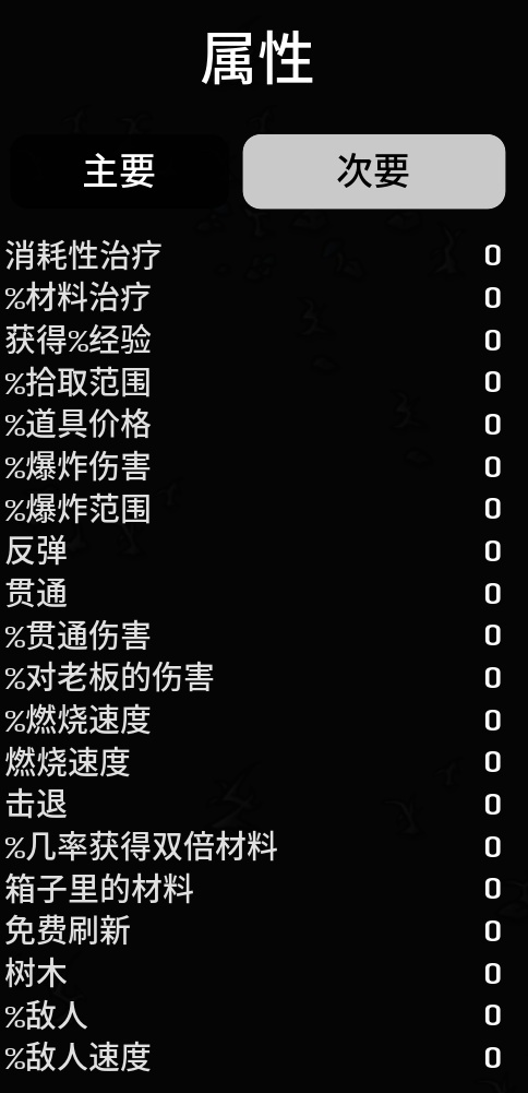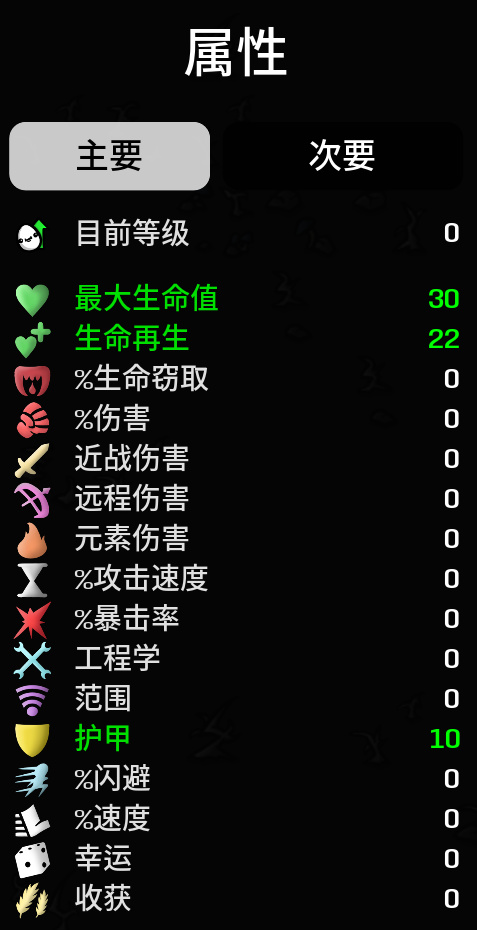 2.屬性加點推薦(優先級從左到右):生命再生(修改增加50%),最大生命值,護甲, 近戰傷害,傷害,暴擊率,閃避,收穫,速度。(本人最喜歡的就是擺完掛機,所以把速度放在最後,但其實速度這個屬性玩起來也可以加,能夠走位躲怪。也挺好用。)