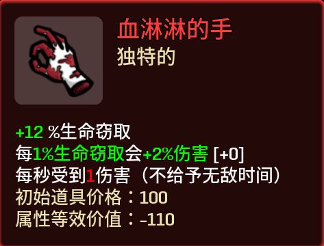 +20最大生命值,+15生命再生,生命再生的修改增加50%,受到傷害時會爆炸,300%的倍率。無法裝備武器。