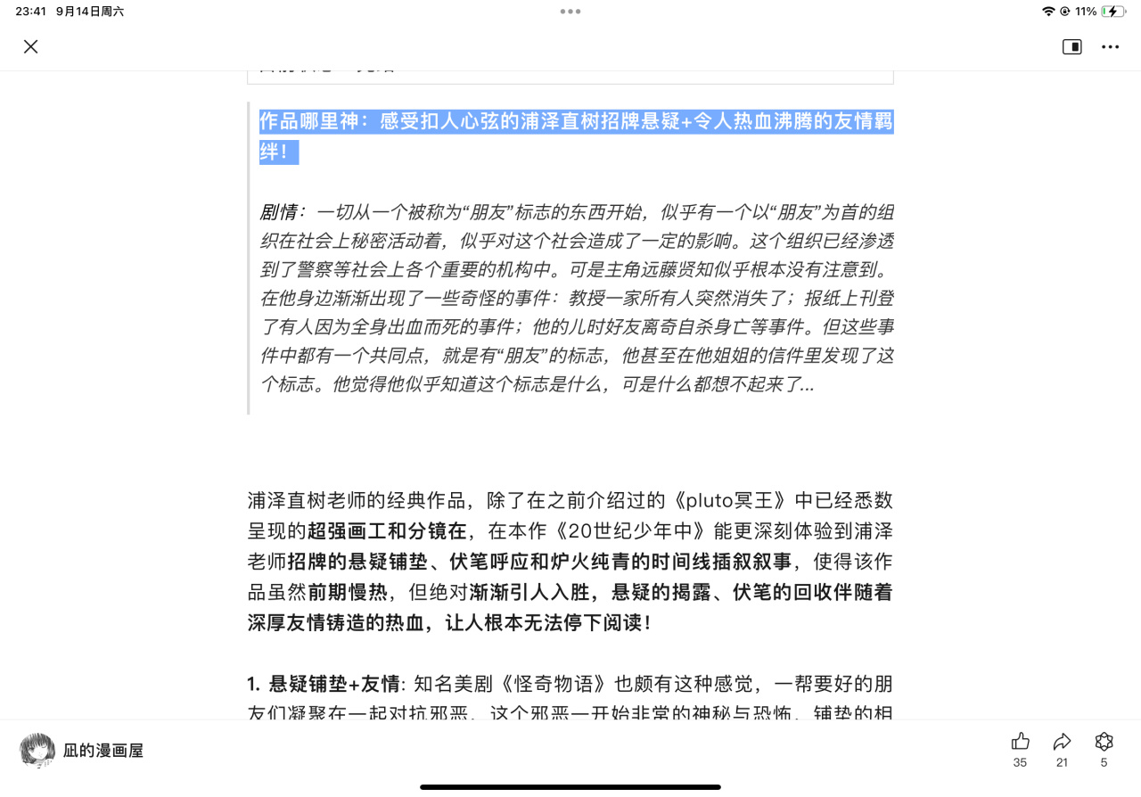 这个公众号成立不久,让我关注的点却不是资源而是作者的推荐,不光有个人喜好也有日本神作前100评分以及阐释,对于想看漫画又不知道看什么的朋友很友好。而且,作者会在每一篇后面附注资源,当然都是我最讨厌的百度网盘……