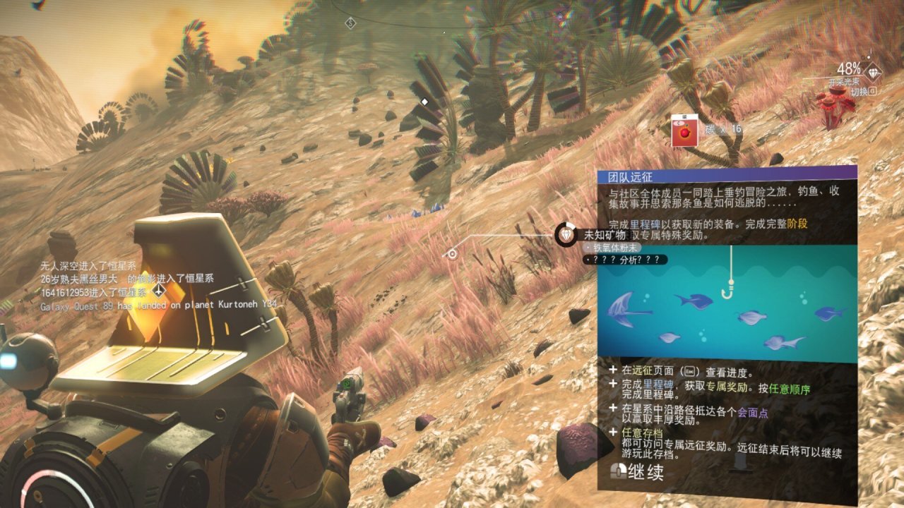 沒錯,無人深空又又又又更新了,這次可以釣魚了,只要在菜單界面選擇遠征15水瓶座就可以跟着詳細的任務引導去釣魚了。我對於無人深空最大的印象就是多年來連續不斷的更新,用各種有趣的遠征,新的玩法來吸引玩家,拿近期的更新來說,3月份的軌道,5月份的漂泊,又到9月份的水世界,無人深空都在嘗試爲玩家帶來不一樣的驚喜和感動。