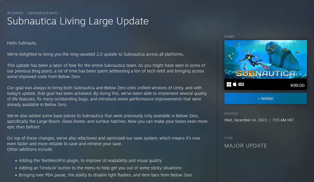 该更新名为“Living Large”,或是 2.0 版本更新。开发商称这是“整个《深海迷航》团队的热情劳动成果”,旨在解决“大量技术问题并从《冰点之下》带来一些改进的代码。”