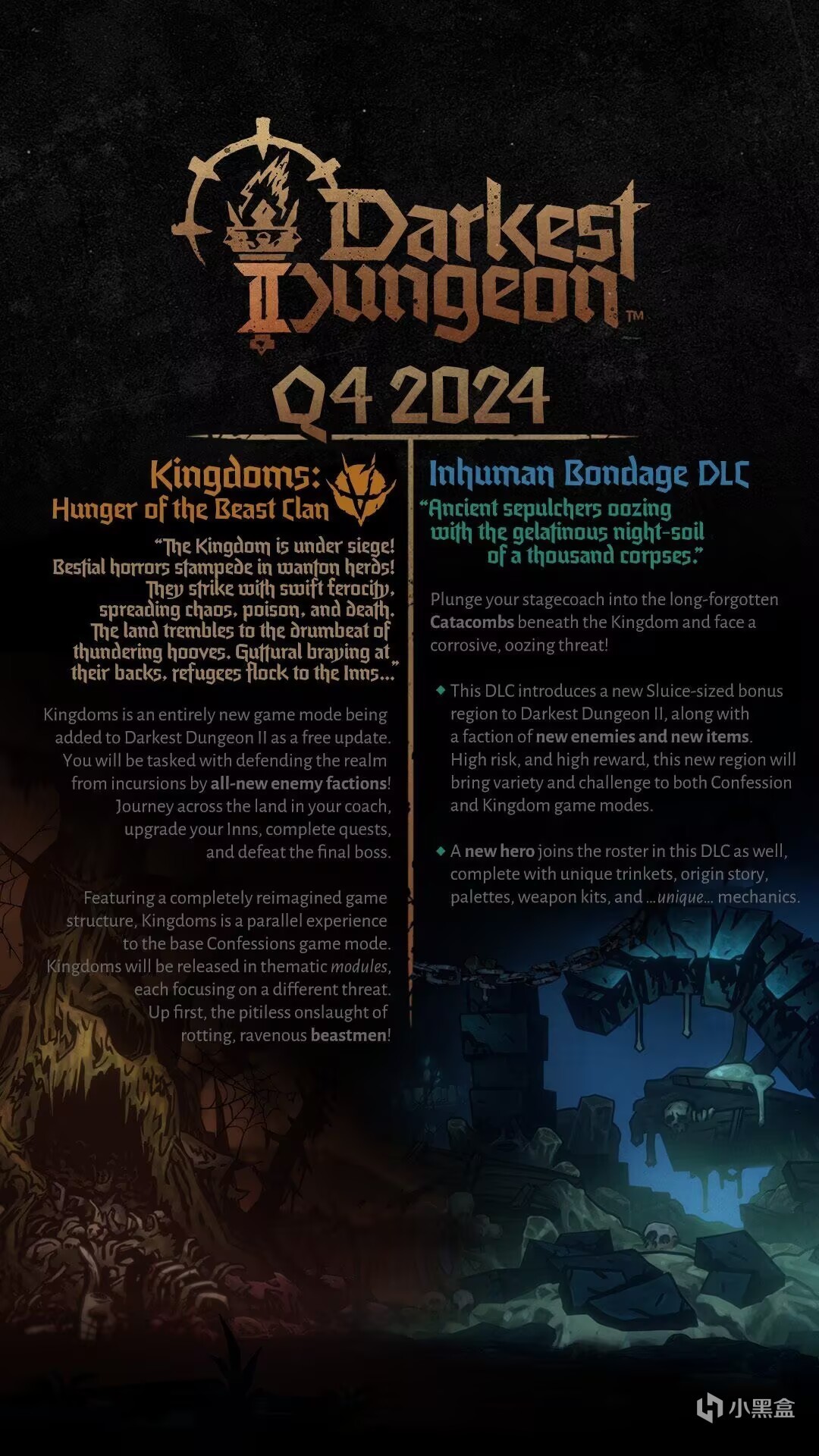 新DLC包含新英雄和新地图和新敌人。"让你的马车驶入早已被遗忘的地方王国下面的地下墓穴,面对着有腐蚀性的渗液威胁"