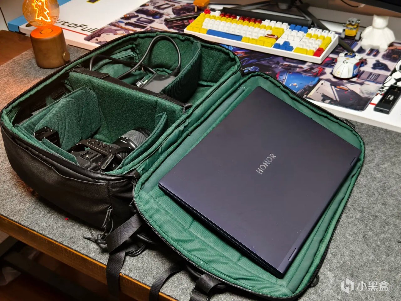 至於榮耀MagicBook Pro 16 HUNTER版有什麼讓我不滿意的地方,那就是電源適配器。雖然榮耀MagicBook Pro 16 HUNTER版本體很輕薄,1.8kg的重量比較適中,但其附帶的電源適配器個頭卻不算小。比如下圖機就是我這次出行所背的雙肩包,筆記本電腦+微單相機+充電寶整體重量應該超過10kg。