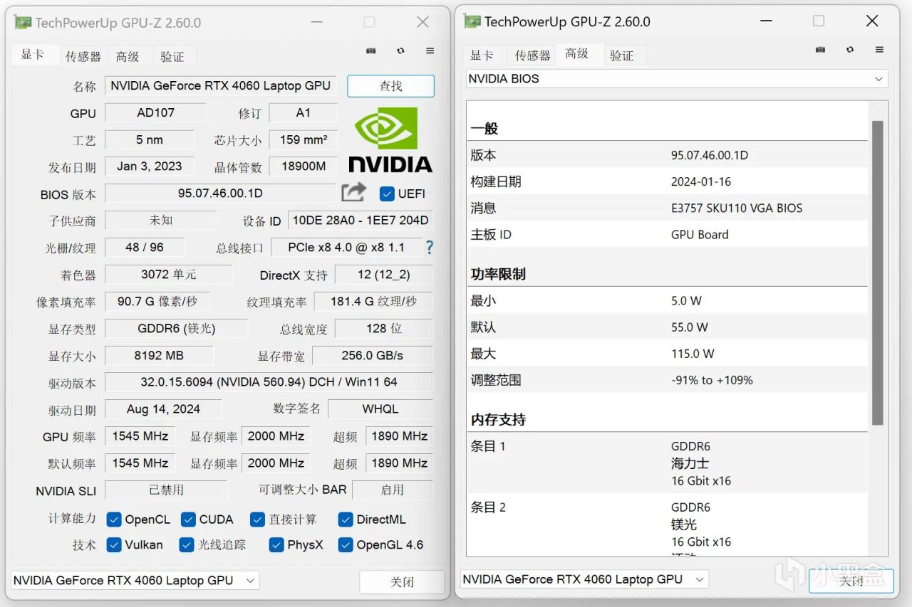 而GPU-Z方面,NVIDIA GeForce RTX 4060 Laptop也算是目前筆記本電腦中的甜甜圈顯卡,其基於Ada Lovelace核心架構,擁有3072個流處理單元,核心頻率爲1545MHz,在超頻模式下可提升至1890MHz。配備8GB GDDR6顯存,默認功耗爲55W,最高可釋放115W。