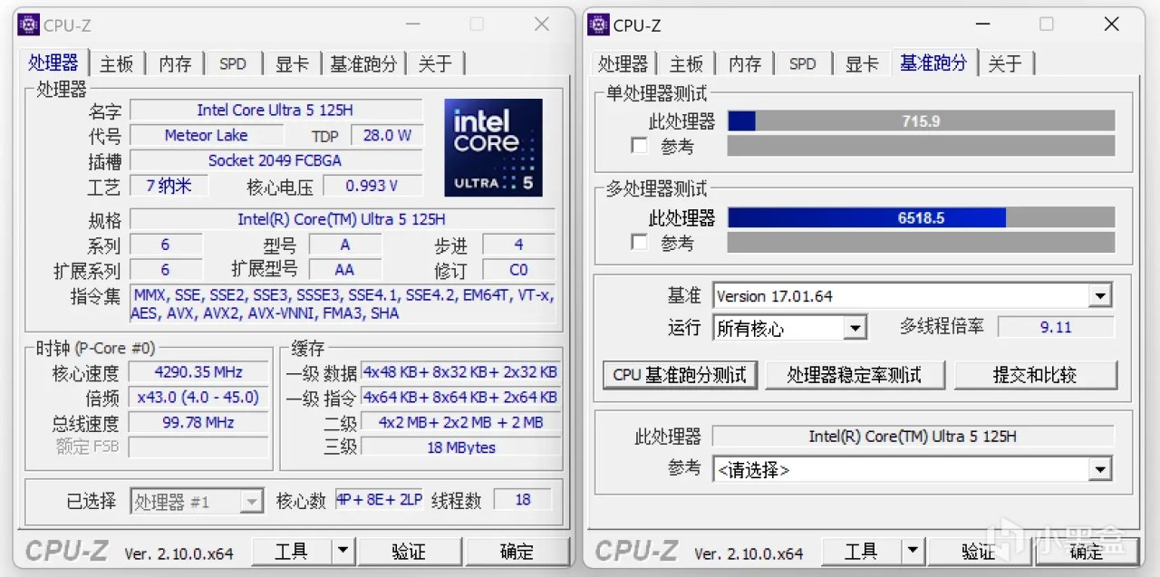 CPU性能方面,Ultra 5 125H處理器的釋放表現非常不錯,採用4+8+2共計14核心18線程,最高睿頻4.5GHz,集成擁有7個Xe核心(112EU)的銳炫7核顯。實測CPU-Z多核跑分6518.5,單核跑分715.9,性能表現是超越自家的i5-13500H和AMD 7840HS等處理器,最關鍵的是該處理器除了CPU傳統計算單元和核顯GPU外,還首度加入了專門應對AI功能的NPU計算單元,進一步提升整機的AI計算能力。
