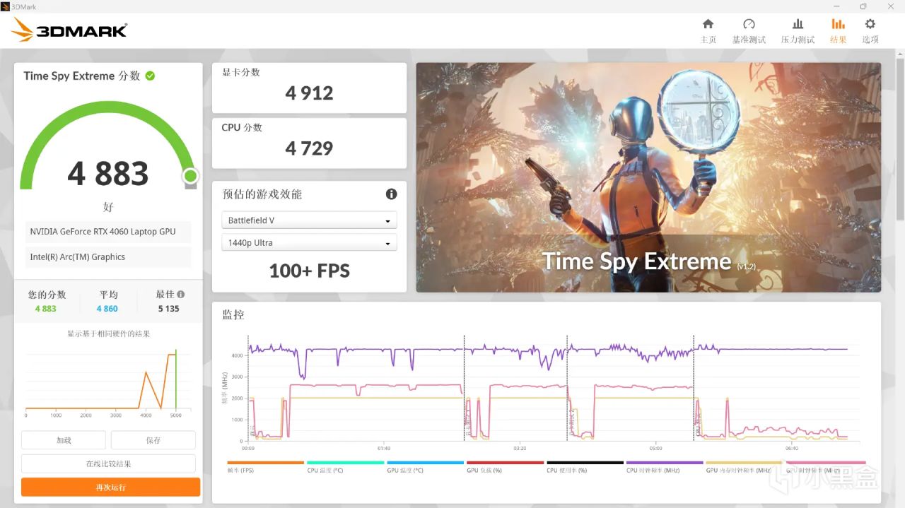 Time Spy Extreme分數爲4883,其中顯卡分數爲4912,CPU分數爲4729。