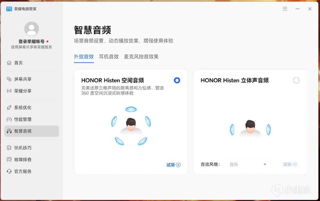 同時,爲了在遊戲中獲得更好的聽感,還可以打開榮耀電腦管家中的HONOR Histen 空間音頻功能,在這個模式的加持下,可完美還原三維聲場的距離感和方位感,聆聽出怪物出現的位置,也進一步加強遊戲的沉浸式體驗。