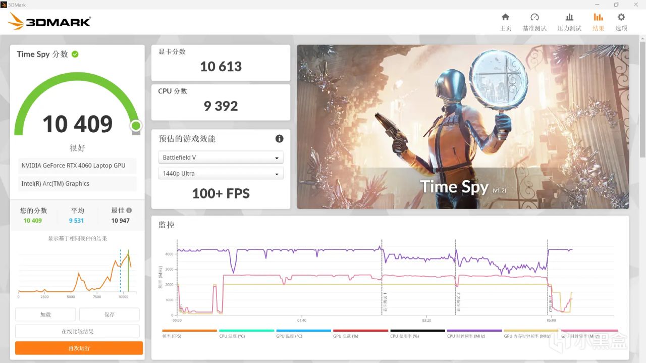 Time Spy分數爲10409,其中顯卡分數爲10613,CPU分數爲9392。