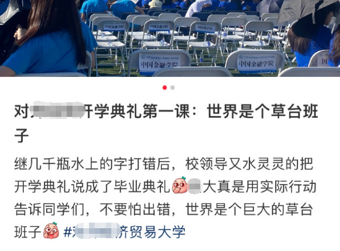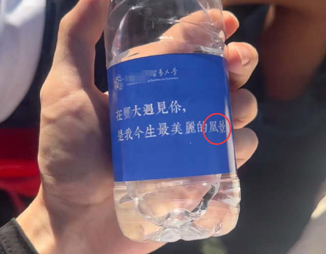 9月12日,北京某211經貿大學舉行開學典禮,分發的礦泉水上,把“風景”印成了“凰景”。