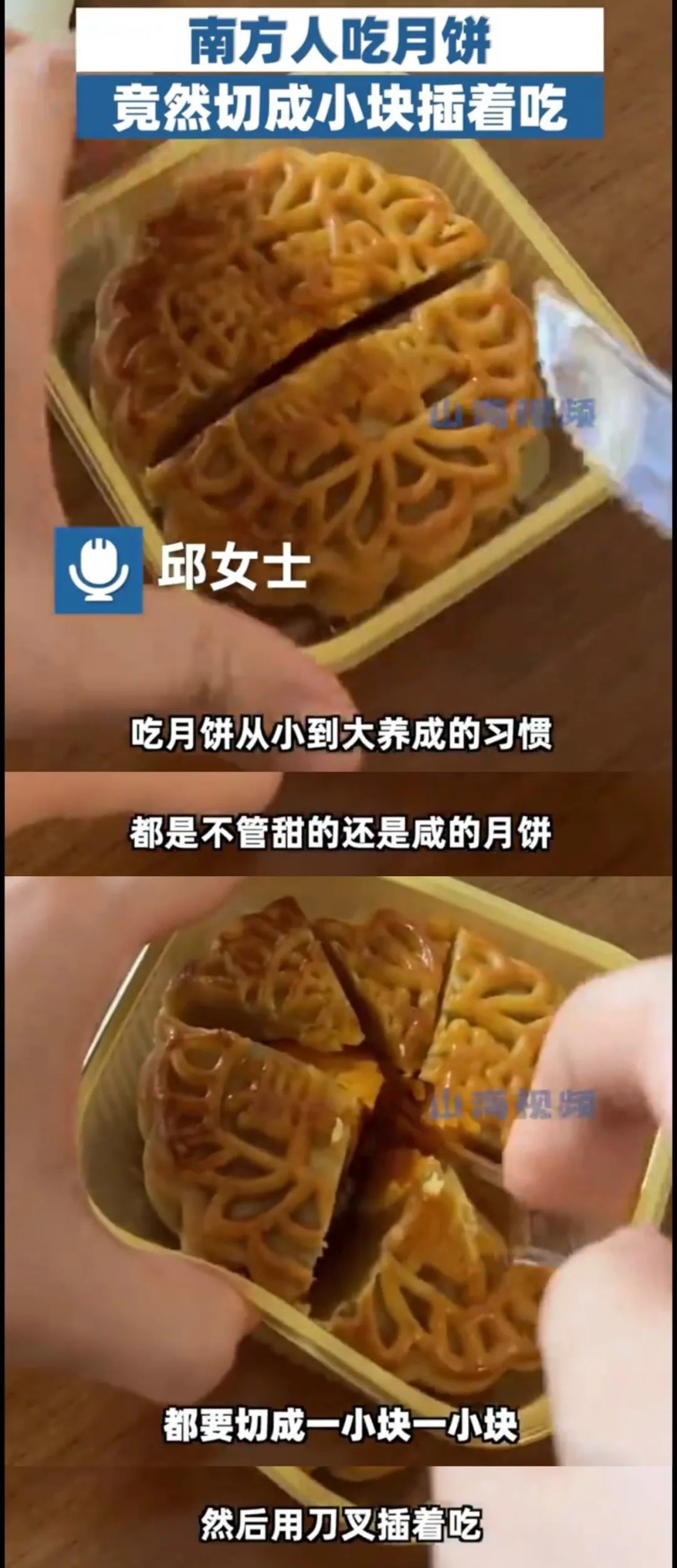 9月12日,廣東潮州。女子分享南方月餅喫法,用刀叉切成小塊插着喫,驚呆北方網友。邱女士稱,這是她從小到大的習慣,沒想到會引起大家這麼大的討論。