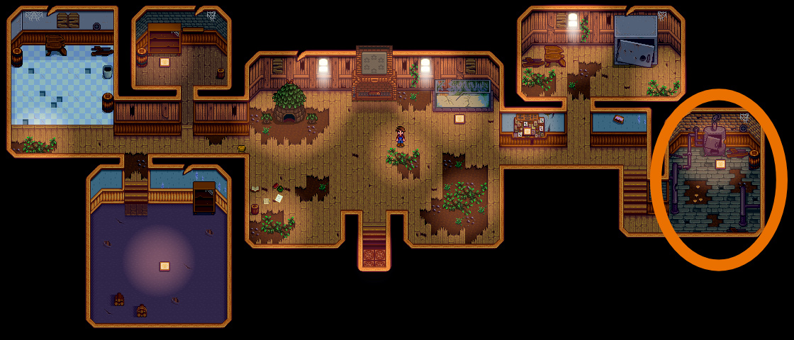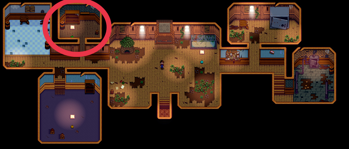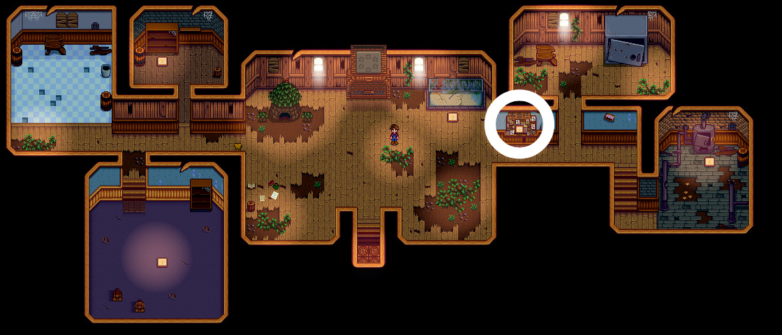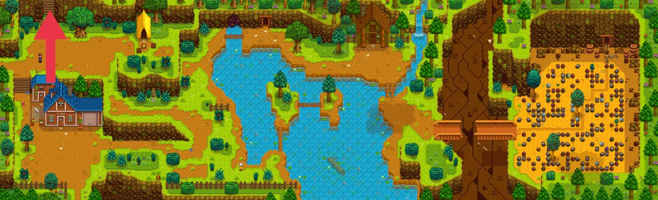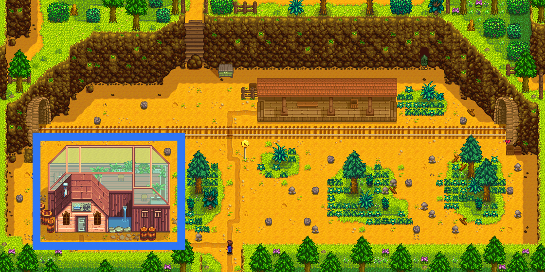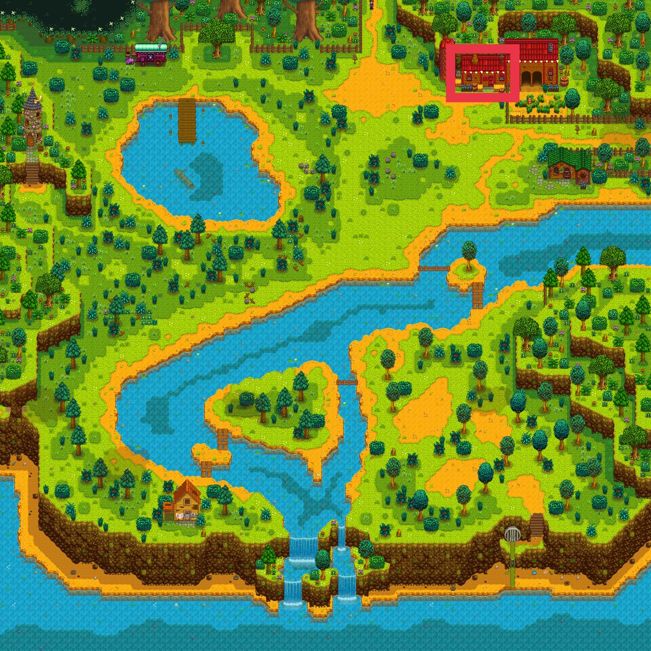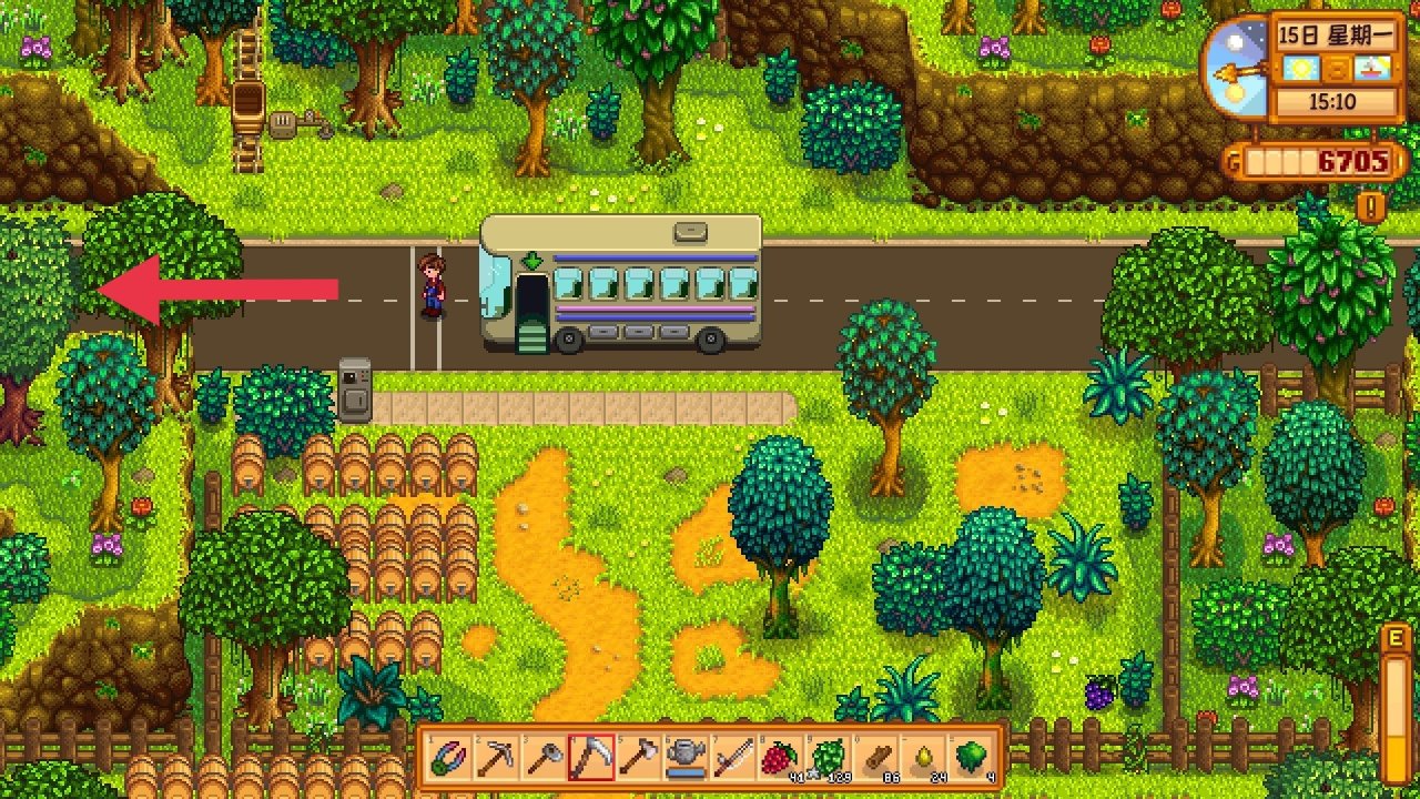 下面给大家说一下小桶的摆放,前期没小屋的情况下我不建议摆在农场(小屋可以到罗宾商店建造),首先就是因为因为农场会生成杂草,你摆放在外面的小桶是有概率被杂草顶掉的,除非你造围栏或者铺地板,但这又是一项工程,而且一般小桶的数量会越造越多,你去造围栏铺地板的造价也会高,其次就是浪费农场区域,这里前期我推荐一个地方给大家,就是公交车站区域,那块区域比较大,村民也很少来,我们只要注意一下摆放位置小桶就不会被踩掉,而且离我们农场又近,方便酿酒,首先是公交车站区域一,大家可以按照我下图位置进行摆放