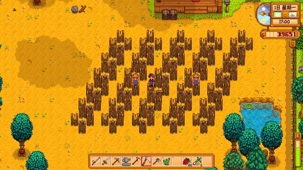 购买完以后我们回到农场种植,当一个季节过去时,不属于下个季节的作物会枯萎,因为我们春季种的是草莓,草莓是春季作物,所以到了夏季草莓会枯萎,但它会变成枯萎的作物,像杂草一样,我们使用镰刀就能清除掉枯萎的作物,但下面的那块地是会开耕且浇水了的,我们可以利用这种特性去保地,能大大减少我们的耕地时间,所以我们回到农场后只用把枯萎的作物收割掉,再把刚刚新放置的五个洒水器那20块地开耕并浇水就能种植啤酒花了