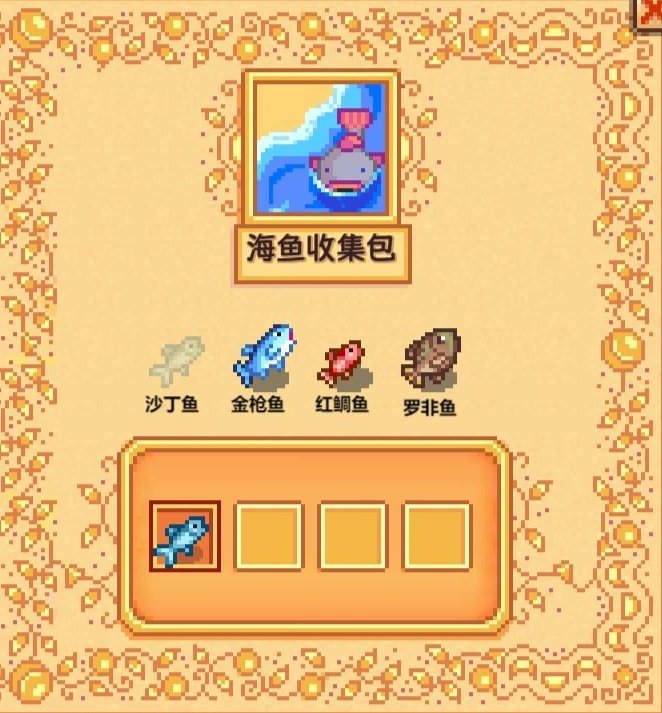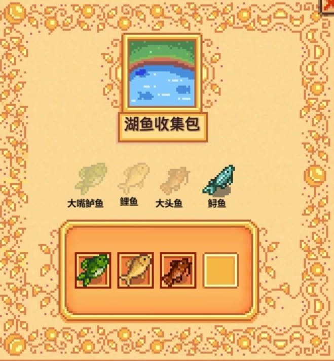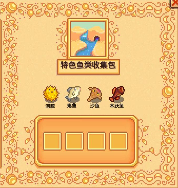 接着是“特色鱼类收集包”,河豚在夏季晴天的中午12.—下午4.之间在海域出没,也就是沙滩区域,鬼鱼在矿井20层的湖里就能钓到,不限季节与天气,木跃鱼在秘密森林的池塘中出没,也不限季节与天气,大家在夏季钓到这三种鱼就行,沙鱼在沙漠池塘可以钓到,等酿酒有钱后就可以去购买金库板块的收集包,全部购买后就能前往沙漠了