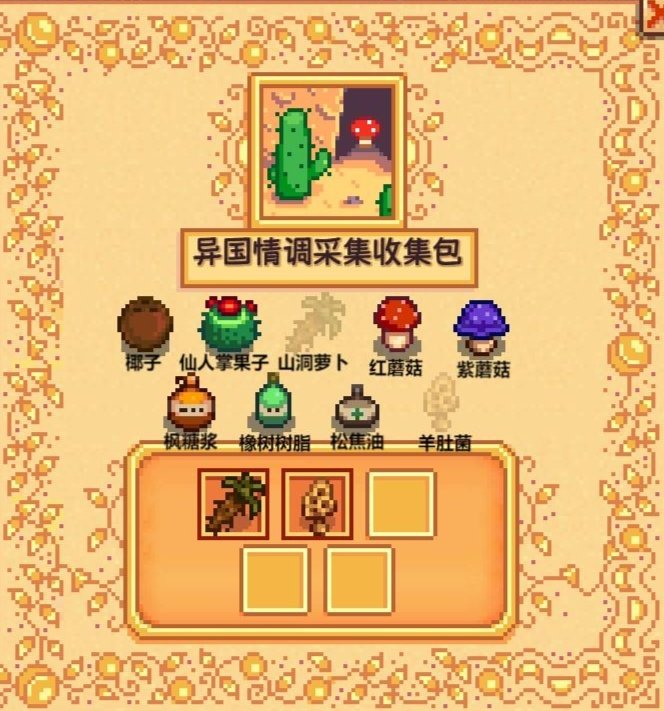 接着是“异国情调采集收集包”,跟我春季流程走的玩家这里山洞萝卜和羊肚菌应该是都捐了的,所以我们只用再选三个物品捐就能完成,这里橡树树脂可以留一个捐,还剩两个物品,下矿如果有获得红蘑菇的可以捐,没有的话就选枫糖浆和松焦油,这两个物品的获取方式就是分别把树液采集器挂在枫树和松树上就能获得,枫糖浆需要等待九天,松焦油是五天,这个收集包不强制在夏季做完,其它季节也可以接着做