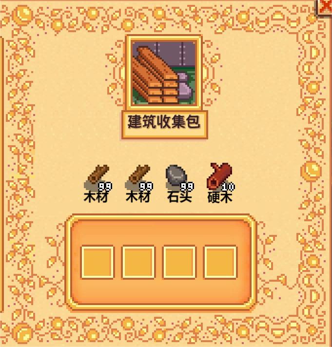 最后是“建筑收集包”,硬木在秘密森林收集就行,跟我春季流程走的玩家秘密森林应该是开了的,所以我这里不重复提秘密森林在哪了,大家有不懂的可以发个评论问,该收集包也不强制在夏季做完,跨季依然能完成,我这里是看资源也有,就顺带做了