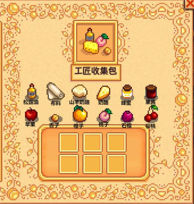 最后是“工匠收集包”,这个收集包在以下12个物品中选6个捐赠就行,在我春季流程那篇攻略中我推荐大家选果蝠洞,原因就是因为选了果蝠洞你这个收集包会很容易完成,下面的6种水果都有概率生成在果蝠洞中,你只需要收集到其中5种水果,再把重复的水果放入罐头瓶中就能获得果酱(耕种等级4级解锁罐头瓶制作配方),把果酱➕5种水果捐赠就可以完成这个收集包,你运气好一点直接捐6种水果也行,这个收集包可以跨季做