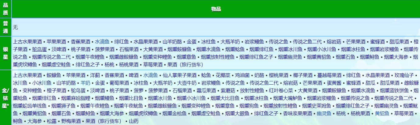 我们新手第一次参加这个节日的话,我不推荐大家加入紫色短裤,第一年先好好玩,等以后参加再加,因为上面涉及的物品比较多,所以我这里根据第一年夏季可以获得的物品,给大家推荐几个加入能获得“最好的评价”和“好的评价”的物品,首先是“最好的评价”,这里建议大家去矿井60层钓鱼,有概率钓到冰柱鱼,加入银星的冰柱鱼可以获得最好的评价,还有就是可以到山区湖泊钓鱼,夏季能钓到鲟鱼,加入金/铱星的鲟鱼也能获得最好的评价