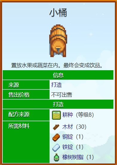 首先耕种等级八级时会解锁小桶制作配方,制作小桶所需的材料为:木材×30➕铜锭×1➕铁锭×1➕橡树树脂×1