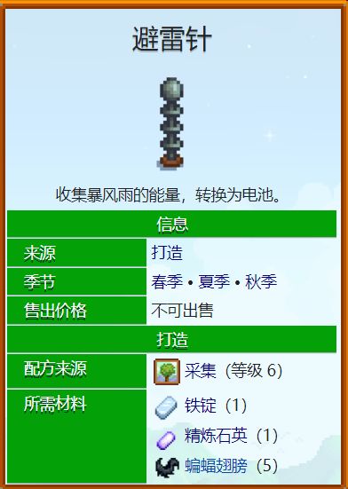 电池组是一种很重要的资源,它是制作铱制洒水器和宝石复制机的必需品,在中后期需要大量用到,我们最好提前做好准备,电池组主要通过放置避雷针获得,采集等级6级后会解锁避雷针的制作配方,把避雷针放置在农场内,雷雨天过后就会产出电池组,同时避雷针还会有概率帮我们阻挡闪电,防止闪电劈中我们的农作物、果树、制品等物品,因为雷雨天主要集中在夏季,夏季13日和26日又是会确定发生雷雨天的,所以我们最好在夏季13日前达到采集等级6级(升级斧头多砍树、去野外找采集品),之后制作避雷针放置在农场等待雷雨天过后收电池组即可,我自己在夏13日前是放置了十多个避雷针,因为闪电劈中避雷针的概率不是100%,也就是说并不是你放置的避雷针都能在雷雨天过后获得电池组,而且前期造小桶要用到铁锭,所以我建议前期放十多个就可以了,资源多的话可以放多一点,后面慢慢增加数量
