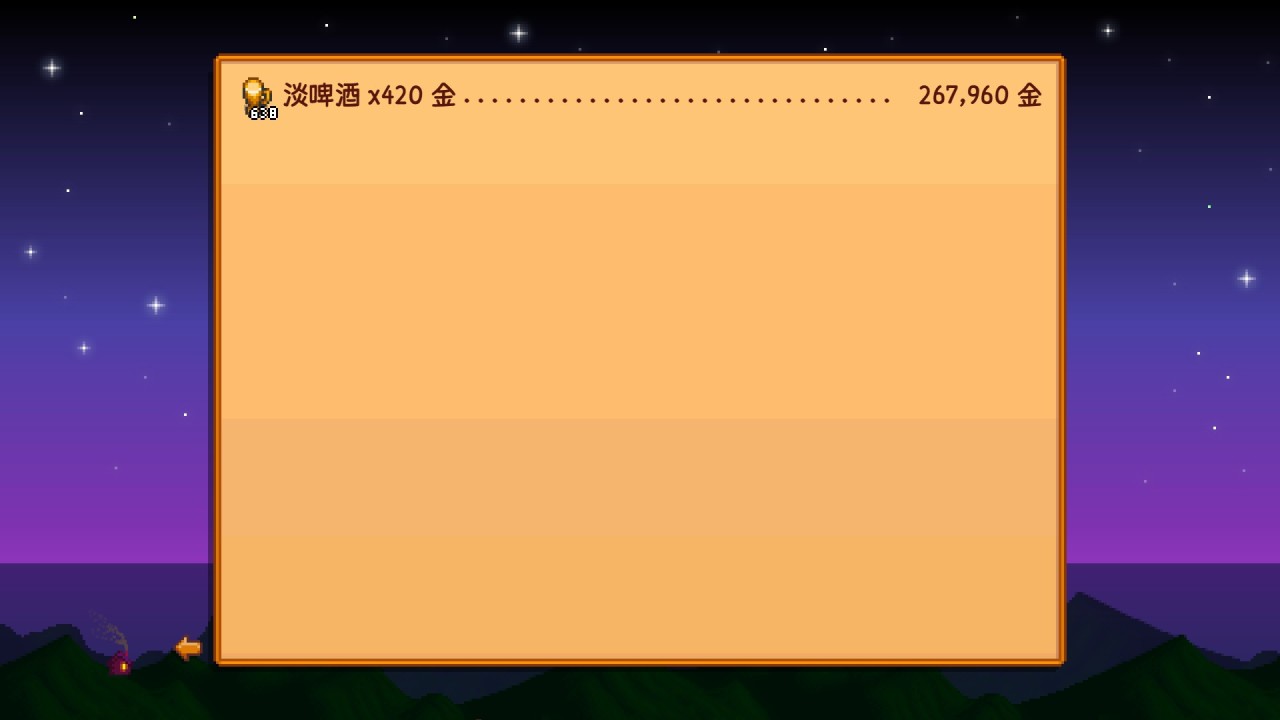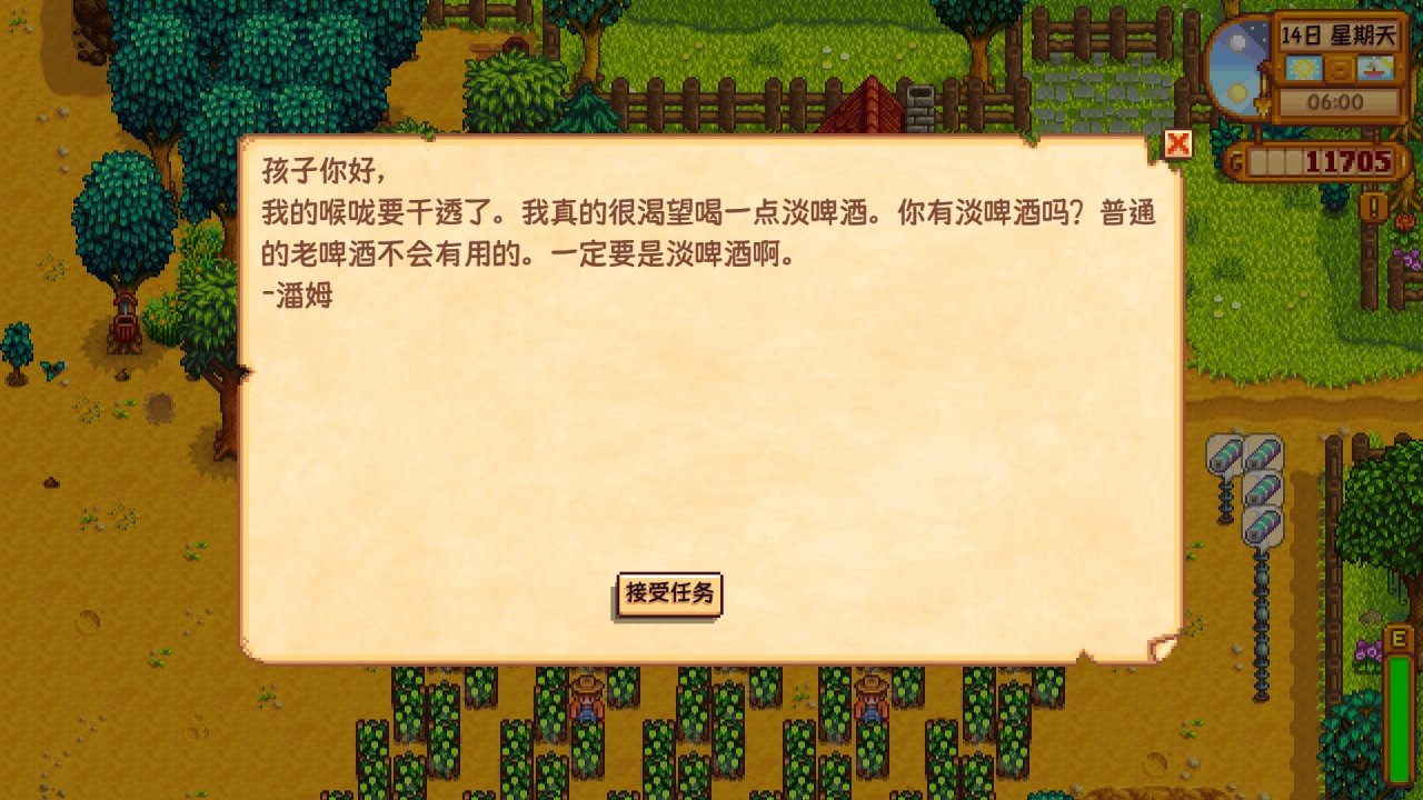 夏季第14日时,你会收到潘姆寄来的一封信,你只要把淡啤酒交给他就能完成这个任务,把啤酒花放入小桶中即可获得淡啤酒(感觉不提也行,毕竟淡啤酒可是夏季的重点),奖励是350金+潘姆1❤️好感度