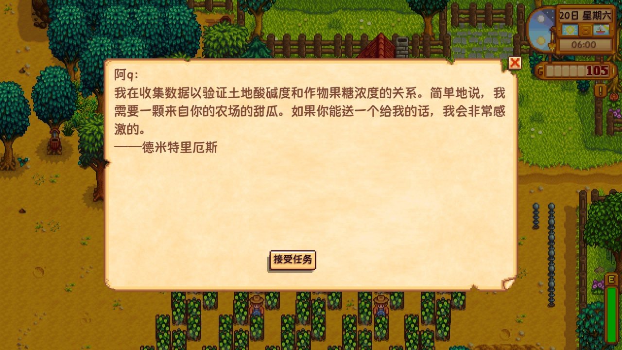 德米特里厄斯寄来的任务,你只需要给一个甜瓜给他即可,奖励是550金+德米特里厄斯1❤️好感度,甜瓜种子可到皮埃尔的杂货店购买