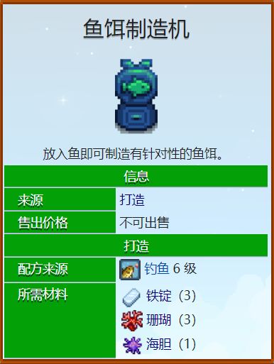 这里建议大家打造一个鱼饵制造机,珊瑚和海胆在海滩区域右侧的小岛可以捡到,打造出来以后就带在背包里,钓鱼时放在旁边,钓到虹鳟鱼后就把它放进鱼饵制造机里,10分钟后就会产出5-10个虹鳟鱼鱼饵,装备这个鱼饵可以提高你钓到虹鳟鱼的概率,如果没有鱼饵制造机你会比较困难,因为首先钓到虹鳟鱼的概率不算很高,会有其它鱼混在里面,其次就是第一年你只有普通鱼饵,最多一次性只能钓到一条虹鳟鱼,获得黄金标签的概率为33%,双重低概率下你很难获得黄金标签,很多时候你钓一整天钓了十几条虹鳟鱼,结果黄金标签才一两个,这种情况都很常见的,好在奖励也不算特别好,大家量力而行,钓烦了直接走就行