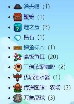 首先是“蟹笼收集包”,这个收集包很简单,我们只用在下面10种物品中选5种捐赠就行,其中鸟蛤、蚌、牡蛎、蛤这四样物品有概率直接在沙滩采集获得,而且下面的全部物品都能使用蟹笼捕捉获得(不限季节),把蟹笼放置在任意水域(注意要添加鱼饵),隔天就能去收获,钓鱼等级3级就能解锁蟹笼的制作配方,但我建议大家目前直接到鱼店购买蟹笼(1500金/个),因为制作蟹笼需要铁锭,在现阶段直接制作划不来,铁锭得留着造更有用的物品,各位购买6个左右的蟹笼就行,放在海里,运气好隔天就能完成这个收集包(如果你像我一样已经捐了一部分物品了,剩三个物品的情况下你可以放到自家农场的池塘中,会产出小龙虾、蜗牛、玉黍螺,这样就刚好可以完成这个收集包,你也方便,不用跑到海滩收蟹笼)