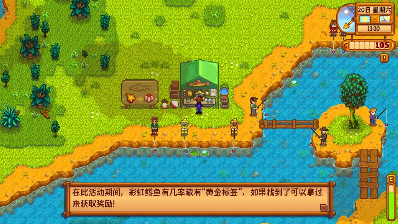 该节日顾名思义就是钓虹鳟鱼的,与平时不同,在节日期间虹鳟鱼是全天出没的,在煤矿森林河流就能钓到,每当我们钓到一条虹鳟鱼时,就会有33%的概率获得黄金标签,获得黄金标签的概率与一次性钓到虹鳟鱼的数量成正比,比如说你一次性钓到两条虹鳟鱼,那获得黄金标签的概率就是66%,三条就是99%,黄金标签可以在附近摊位上兑换奖品