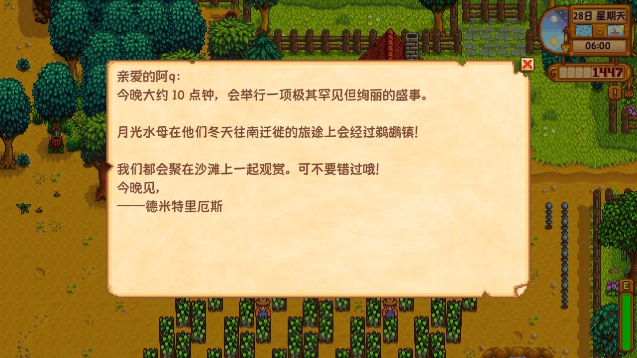 最后其实这个节日就是看水母的,没有物质上的奖励,但会给予你一点精神上的鼓励,整个夏季你一定很劳累,这个节日就是让你放松身心的,喜欢聊天的就去周围与村民对话(有些藏的很隐秘),不想聊天的就直接去和刘易斯对话选择开始看水母即可,看完后节日就结束了,你会回到农场,时间是凌晨12.,一觉过后,告别夏季,迎来秋季