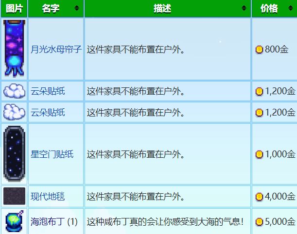 在该节日上,皮埃尔会在海滩右侧摆摊,具体商品如下图所示,可买可不买,没什么特别重要的,喜欢这些装饰品的可以购买