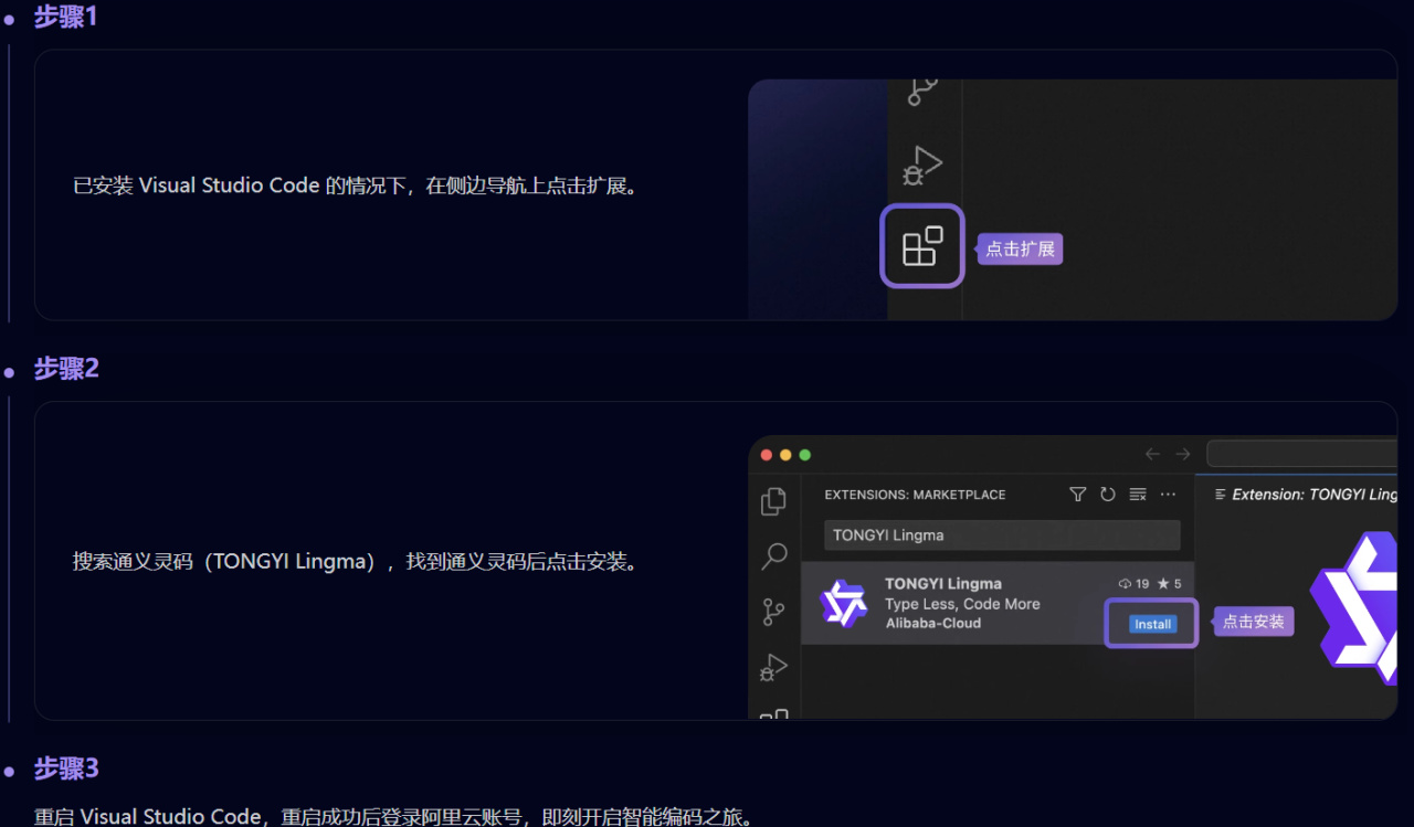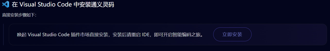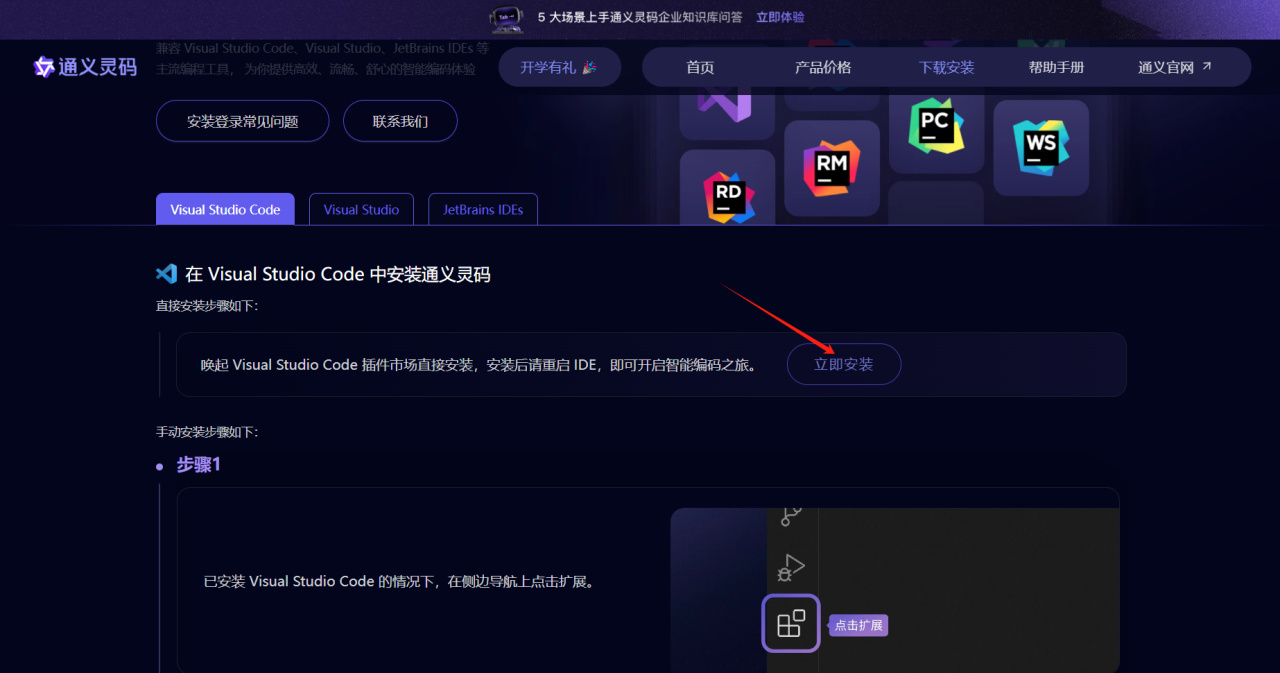 我們回到通義靈碼官網,懶人的話直接點擊立即安裝喚起插件市場,點擊打開