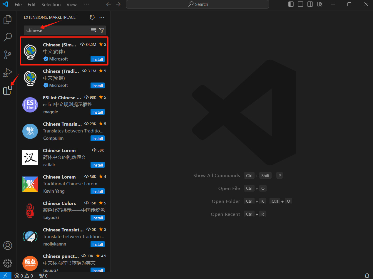 進來之後發現界面是英文的,看着不舒服可以在插件市場下載簡體中文插件並安裝
