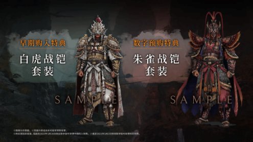 2023年3月3日正式发售前在Steam购买任意版本《卧龙:苍天陨落》都将免费获得数字预购特典“朱雀战铠套装”,3月16日前购买还可免费获得早期购入包含特典“白虎战铠套装”。