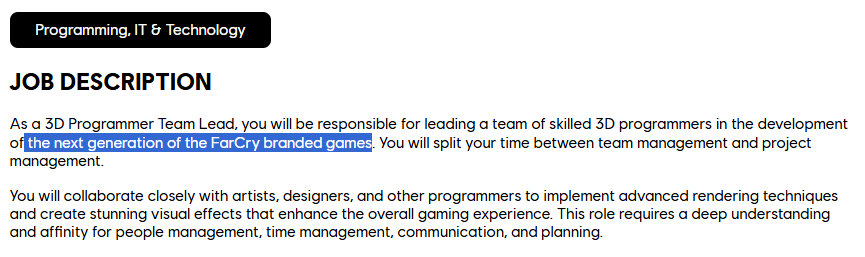 最近有外媒发现,育碧在自己的招聘官网上发布了数个有关《孤岛惊魂》项目的职位,包括3D编程团队负责人、高级程序员、引擎程序员等,其中在3D编程团队负责人的职位描述中写到:应聘人将领导一直技术娴熟的3D开发团队开发下一代《孤岛惊魂》作品。这些招聘的发布也意味着两个《孤岛惊魂》项目已经正式处于开发当中。