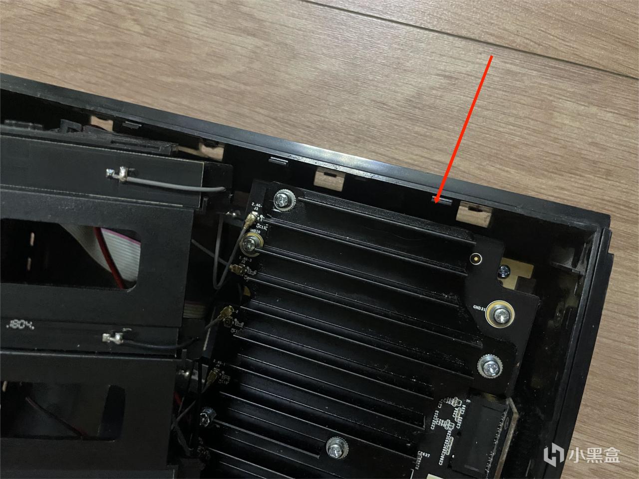 接着再切割两边,拿着4010的风扇宽度比着切,写完后你就会发现风扇与天线架的支架形成了天然的限位(箭头位置)。这也就是我为什么要买4010风扇的原因。注意切割完后打磨一下底面。