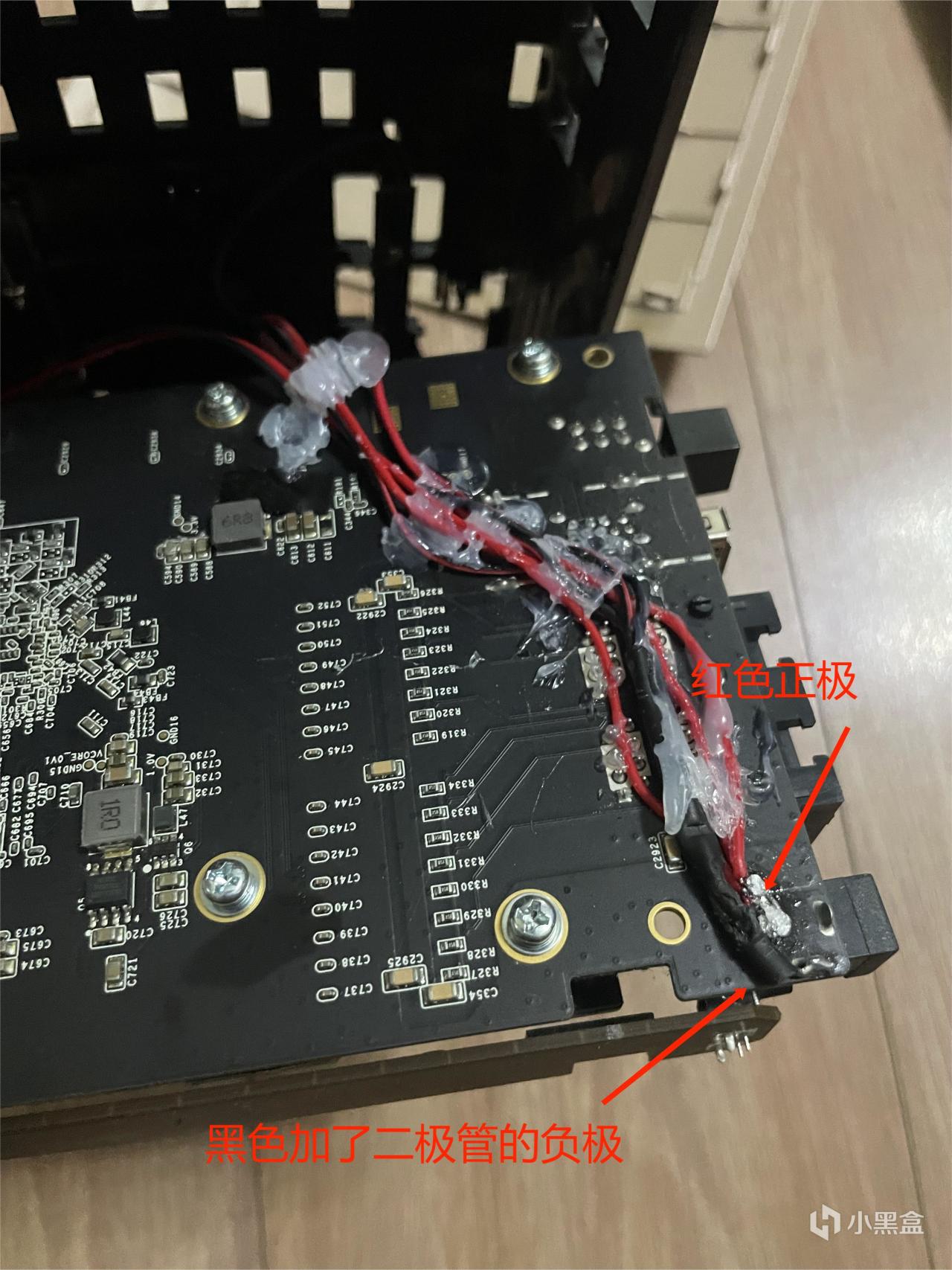 最后拆下主板(记得标记一下天线的位置),把风扇的正负极连接到如图针脚。如果担心击穿可以在负极加上稳压二极管。最后再用热熔胶固定(焊油用完了,请忽略我的鸡屎焊)