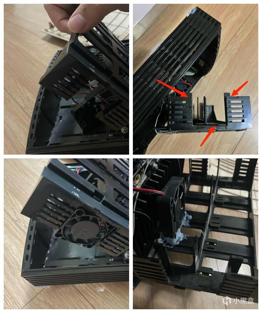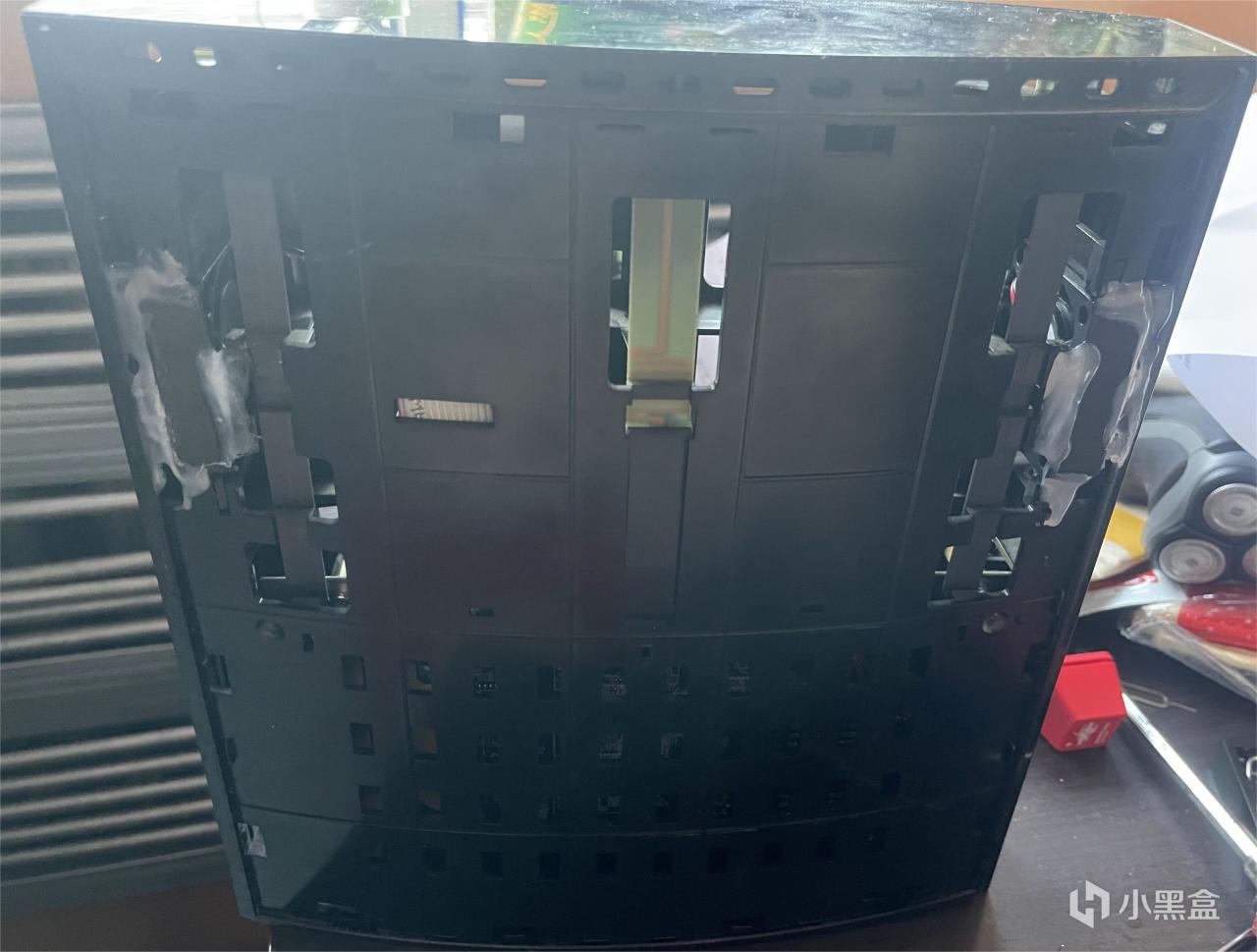 接下来给背面开孔,可以以支架固定柱为参照物切割,切割完后风扇可以顺着这个洞插入到天线架里