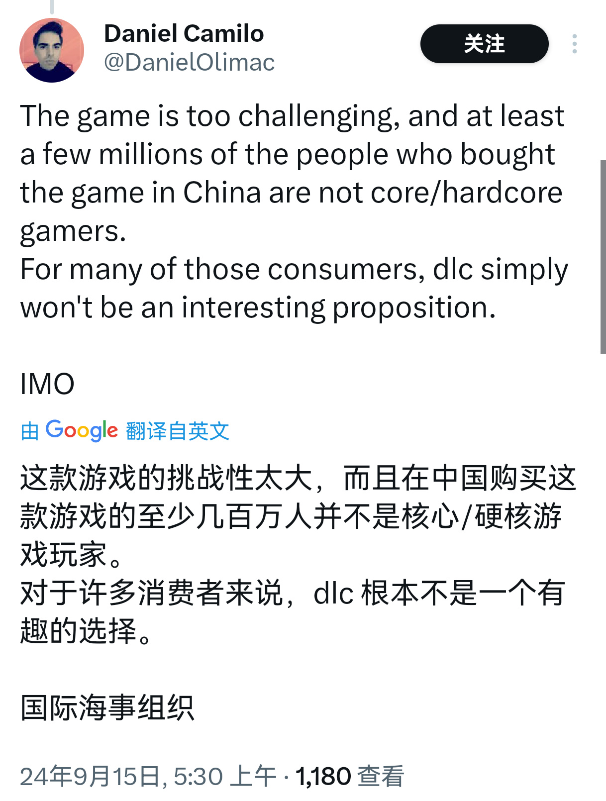 另外一點就是他察覺到許多人認爲《黑神話:悟空》“很難”。他進一步解釋道,遊戲具有挑戰性,但我國很多購買這款遊戲的玩家(據他稱至少有“幾百萬人”)並不是核心或迎合玩家,因此在嘗試過本體後,DLC 對於他們並不再具備吸引力。他特意提到,這只是他的想法。