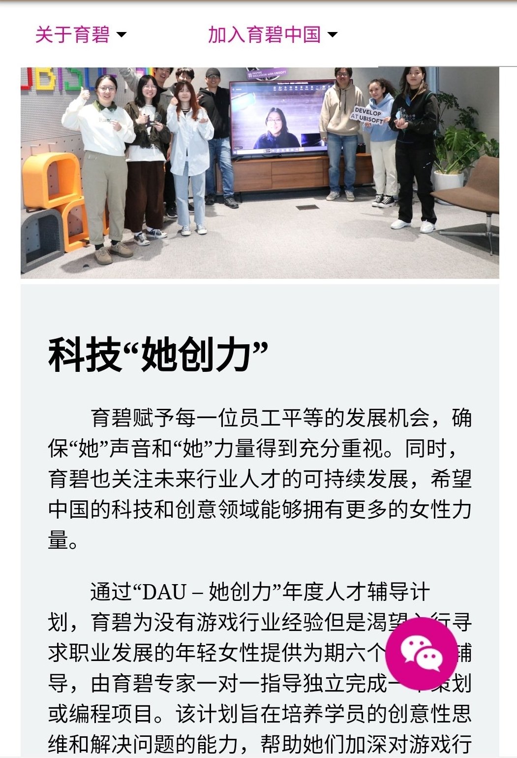 爲了培養與多元化玩家社區相匹配的遊戲開發人才,育碧中國工作室推出了“Develop at Ubisoft - 她創力”計劃。旨在爲熱愛遊戲並渴望提升遊戲策劃和程序技能的女性人才提供支持和指導。入選候選人將有機會在遊戲開發專家的輔導下完成項目,並在結業後參加育碧工作室的典禮,與導師及其他參與者深入交流遊戲開發心得。