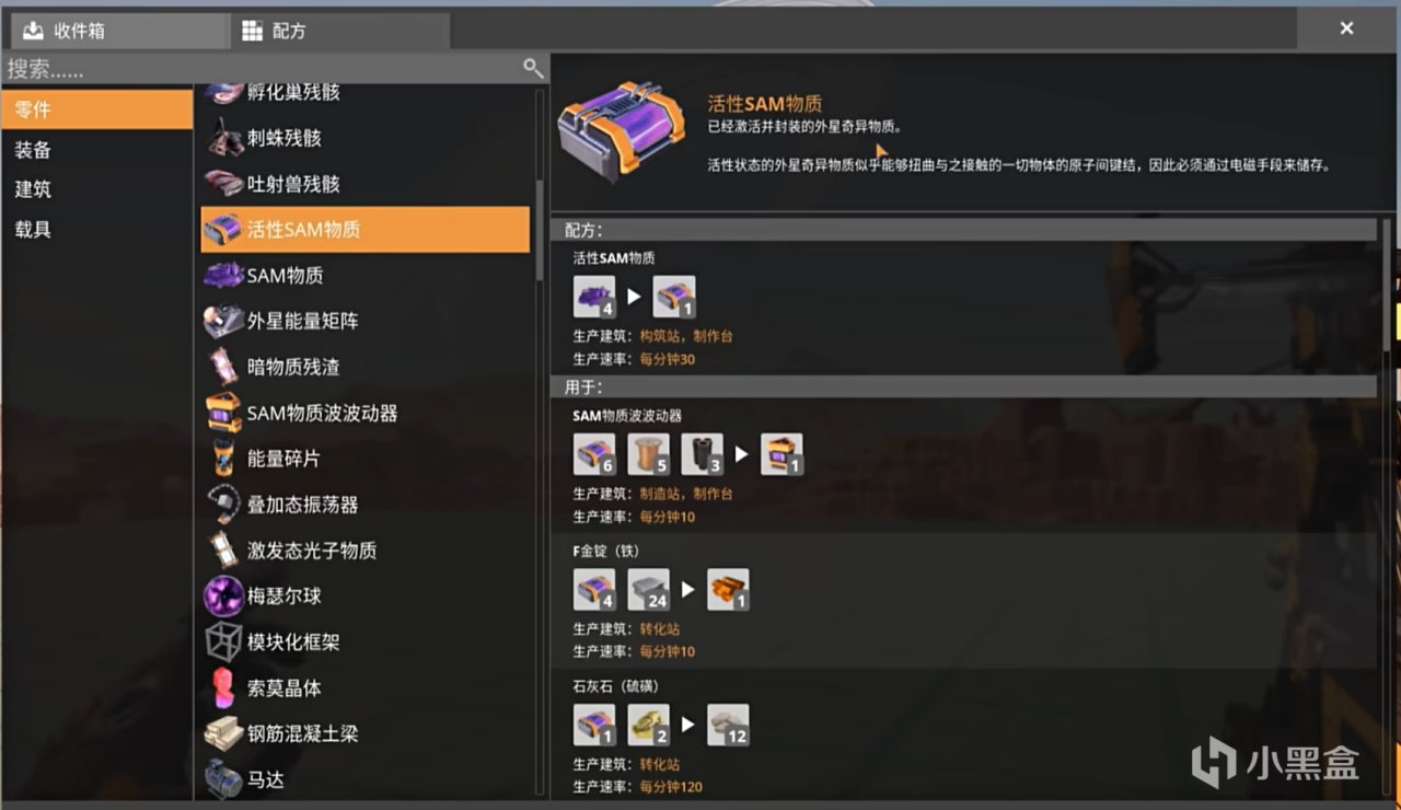 首先最重要的部分在于:矿石转换——消耗萨姆矿石可以完成游戏中所有类型矿石之间的互相转化,虽然这个可能略亏(萨姆矿属于游戏稀缺资源),但是因为现在的版本感觉是游戏为了引导分布式工厂布局,故意给资源点都撇的比较开,那么一方面转化机制可以应急。