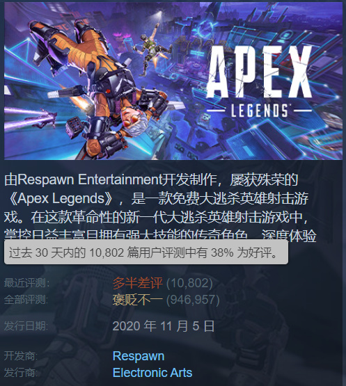 评价呢?评价更是赶O超3(某多人FPS和某卡牌),近一个月狂砍不到40%的好评率,看到发行商烂里那个金灿灿的Electronic Arts了吗?这下味道对咯!EA诚不我欺!