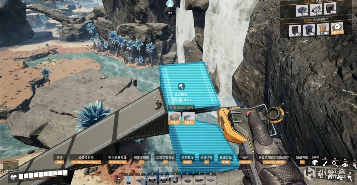 不過遊戲地圖設計讓玩家在有些時候並不能輕易達到那些地方,儘管遊戲的建造可完全無視物理直接搭一條天梯過去,但恐怕早期從其他遊戲輾轉而來的玩家以及看到這些精美風景不忍破壞的玩家往往會忽視自己擁有的這項能力而用雙腳丈量大地,並在這個過程中獲得其他各式物資,解鎖其他的科技。
