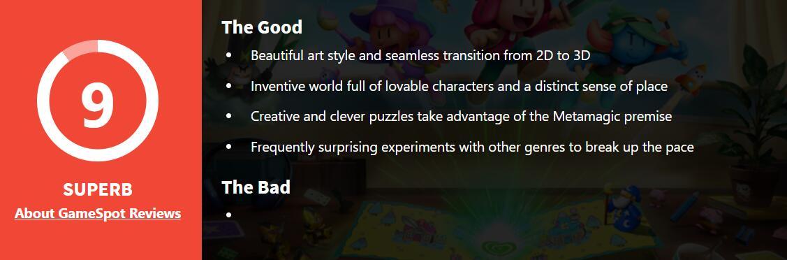 GameSpot(9分):这是一款仿佛能让人回到童年的创意之作。精致的美术风格以及2D到3D的无缝衔接给人留下了印象的深刻。多种类型并存、独特的世界及解谜设计都很不错。除了多处的惊喜外,整个绘本中的冒险过程十分欢乐。
